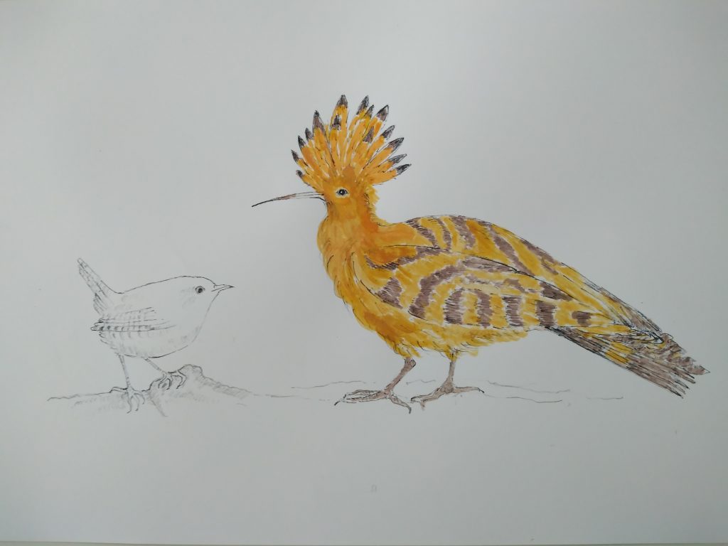 The native wren asks the exotic migrant hoopoe, “have you come here like that parasitic cuckoo to turf us out of our own nests? “